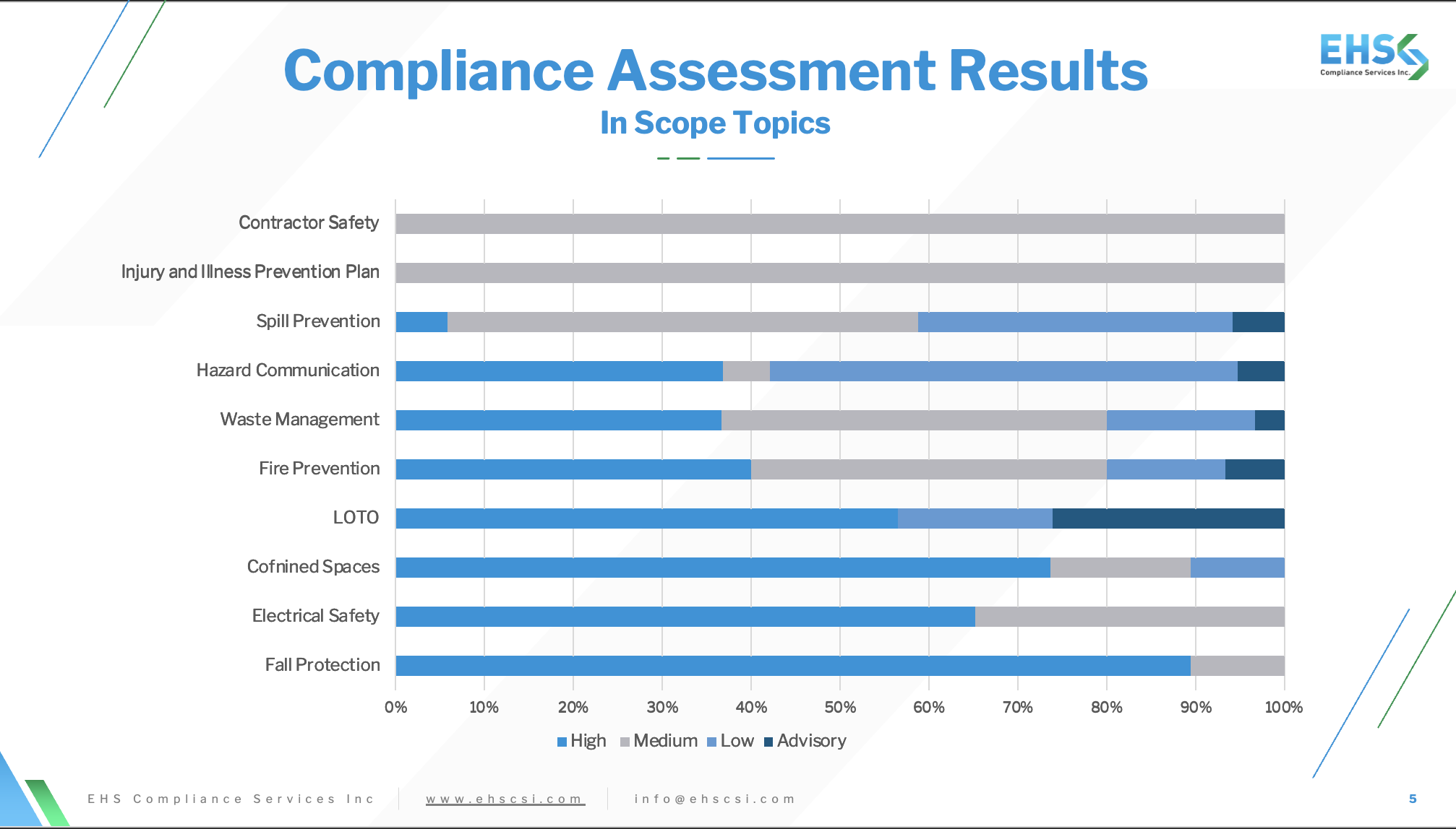 High risk findings showed up across sites, they weren’t isolated. Not surprisingly the highest risk were noted in fall protection, electrical safety, confined spaces and lockout/tagout. We worked through a risk based mitigation strategy with our client to close these gaps.
