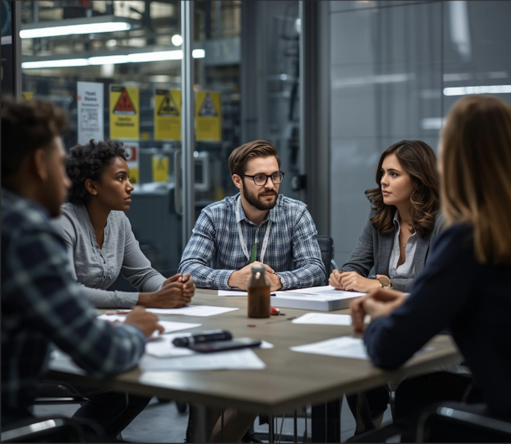 Safety committee meeting in an industrial setting reviewing performance metrics and discussing action plans around a conference table.